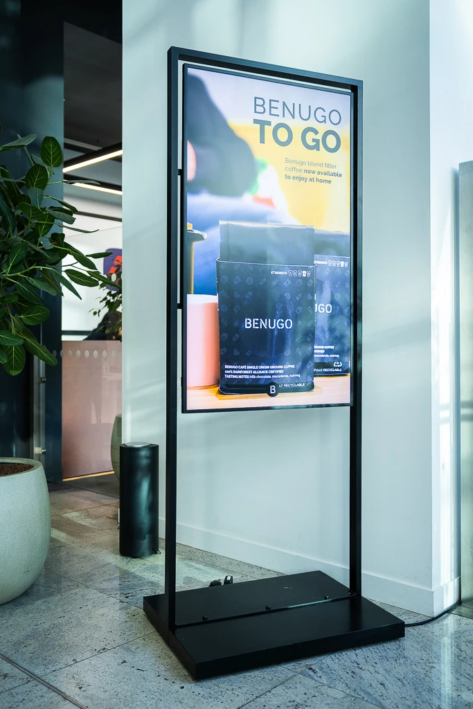 Ultra-slim freestanding digital display screens with vibrant 4K resolution and commercial-grade durability.